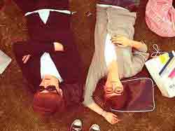 М. Берет с собой шорты, футболку и шляпу от солнца. Когда они приезжают на место, он раздражается, что она постоянно носит его футболку и шляпу.