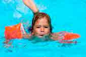 Самое лучшее место, где можно научить ребенка плавать , – бассейн. В небольшой группе или индивидуально чадо познает азы поведения на воде и освоит основные приемы. Это если подходить к вопросу вдумчиво. А если вы живете в городе, в котором нет бассейна, где учат детей плавать, или же хотите познакомить кроху с водой самостоятельно? Не беда, все решаемо! Отправляемся на водоем. Лучше, если это будет озеро. Выбираем место помельче, проверяем тщательно дно и приступаем к обучению. Отрабатываем приемы дыхания, нырок и… надеваем нарукавники.