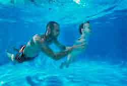 - Становимся напротив ребенка, берем его за руки. Делаем вдох и погружаемся с ним в воду. Сначала глаза могут быть закрыты, но затем ныряем с открытыми глазами.
