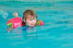 Самым оптимальным приспособлением для обучения ребенка плаванию считаются нарукавники. Они не сковывают движений и помогают крохе держаться на поверхности. Кроме этого, нарукавники не мешают малышу грести руками. В некоторых случаях тренеры по плаванию одевают детей в специальные жилеты, а также используют в качестве поддержки надувные мячи.