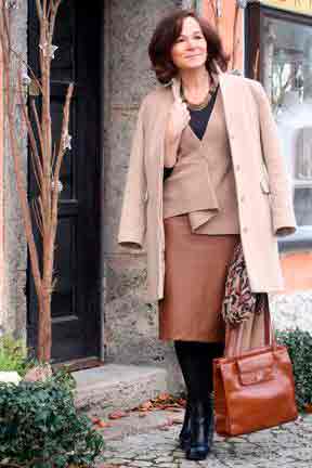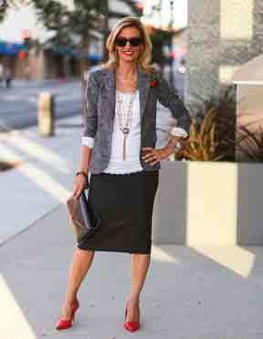Важно усвоить, что мода – это не юбка в стразах и перьях. Мода – идеально сидящее на фигуре платье или удлиняющие ножки брючки. В любом возрасте можно выглядеть сексуально, притягательно и роскошно. Добавит элегантности в женский образ приталенный жакет, обувь на низком каблуке или шпильке, небольшой клатч.