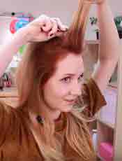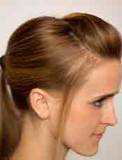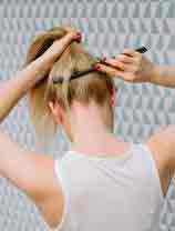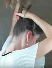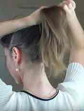 - Вновь отчешите волосы назад, но теперь не приминайте их и не вводите зубчики/щетину глубоко: нужно лишь пригладить лицевую сторону и задать направление. Удерживая волосы руками в этом положении, соберите их в хвост чуть выше мочки уха. Чтобы начес не деформировался, воспользуйтесь резинкой с крючками.