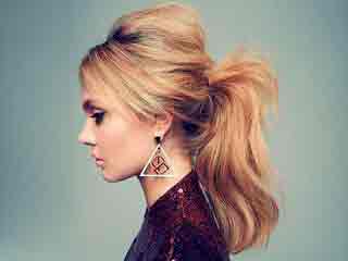- Если у вас треугольное лицо, а также высокий лоб, рекомендовано избегать начесов в области макушки, однако можно равномерно прибавить объем по всей поверхности головы, а сам хвост расположить сбоку. Либо же сделать челку, включая ее имитацию.