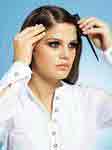 Прямую, длинную густую челку, а так же любые фигурно подстриженные и прореженные челки перед началом укладки необходимо отделить горизонтальным пробором. В этом случае совершенно не лишним будет выпустить у висков несколько прядей, оформляя красивое обрамление лица.