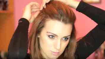 Разделите волосы двумя горизонтальными проборами на верхнюю и нижнюю зону, соберите пряди верхней зоны и слегка начешите или надо лбом, или на макушке.