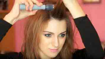 Шаг 1. Нанесите средство для объема на корни волос, затем высушите феном, слегка завив их.