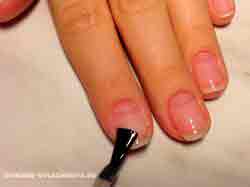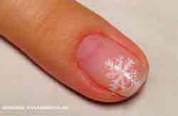 - Нанесите на ноготок базовое покрытие, позволяющее выровнять ногтевую пластину перед нанесением лака для зимнего маникюра.