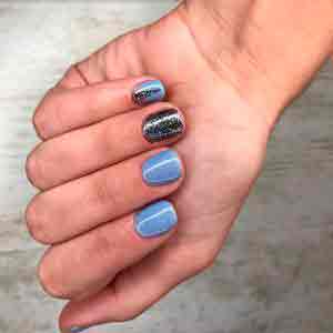 - Покройте часть ногтевой пластины лаком голубого оттенка в виде рукавички. Такая идея маникюра на Новый год будет выглядеть весело и оригинально.