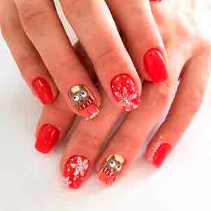 Неформальная обстановка, которая не обязывает вас придерживаться дресс-кода, позволит выбрать оригинальный новогодний маникюр с рисунками в виде зверьков, сов, медвежат, оленей и т.п.