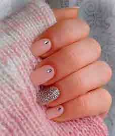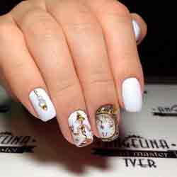 Можно также попробовать однотонный маникюр на Новый год в пастельных тонах, украсив несколько ноготков блеском или красивыми рисунками новогодних часов, нежными снежинками и т.д.