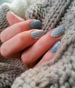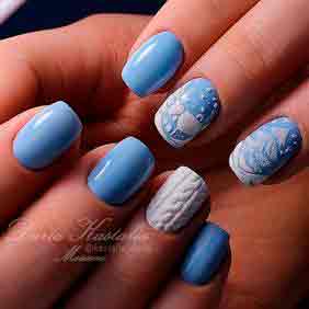 К модным зимним трендам нейл-арта относится интересный вязаный маникюр, подходящий и для новогоднего дизайна ногтей. Красивый новогодний маникюр с вязаным эффектом стоит выбирать в матовом белом, розовом и голубом цвете.