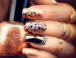 Из страз и блесток разного размера и формы вы можете формировать полоски, треугольники, украшать части ногтя в геометрических фигурах или декорировать рисунок, либо узор.