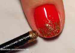 Новый год 2014 вызывает ассоциации с мандаринами, поэтому не удивительно, что новогодний рисунок может называться «Насыщенный мандарин». Для этого нужно на ногтевую пластину нанести пару слоев оранжевого цвета. Краешки ногтей (пока лак не застыл) засыпать разноцветными блестками.В ниже расположенных видео показано как сделать новогодний модный маникюр 2014 в виде ёлочки и с леопардовым принтом