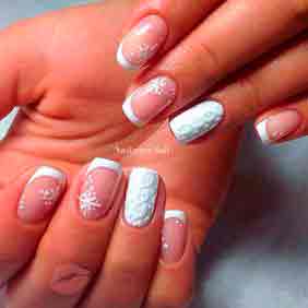 Нежный новогодний маникюр со снежинками. Красивые, аккуратные и ажурные снежинки великолепно смотрятся на ногтях разной длины и формы.