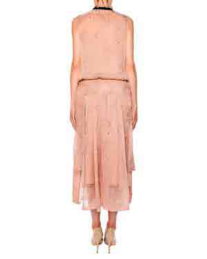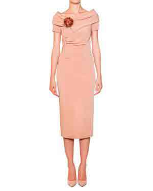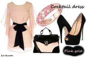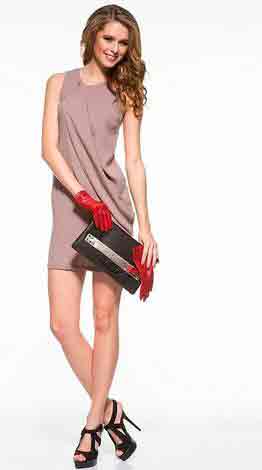 Если вам интересен приталивающий силуэт, в этом случае интригующе будет бежево-розовое платье с декоративными элементами защипами или складками. Гармонично в такой образ впишется пальто классического покроя с элегантной сумочкой и батальонами или лодочками на шпильке.