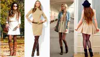 С телесными колготами никогда не надевают высокие теплые сапоги, особенно черные. В холодное время года имитация голой кожи ног выглядит нелепо и неуместно, гораздо правильнее будет отдать предпочтение коричневым или серым цветам.