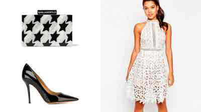 Если на белом платье имеется черный принт, то можно смело надевать к нему черные туфли. А вот остальные аксессуары надо подбирать либо в тон, либо по принципу контраста. В первом случае получится строгий черно-белый лук, во втором – яркие краски добавят образу живости.