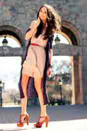 Подбирая образ для дружеской встречи возможно комбинировать бежево-чёрное платье с элегантным тёмным плащом, высокими сапогами или ботфортами и миниатюрную сумочку.